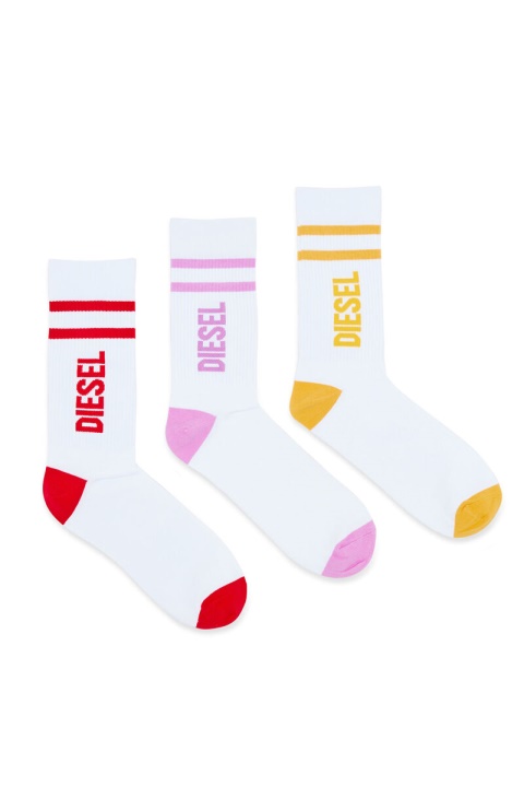 שלוש חבילות של גרביים לבנות בתערובת כותנה מתיחה. כל זוג מתהדר בפסים מנוגדים על השרוול ובאותיות דיזל בצד כדי להתאים את העקב והבוהן בשלושה צבעים מגוונים: אדום, צהוב וורוד.