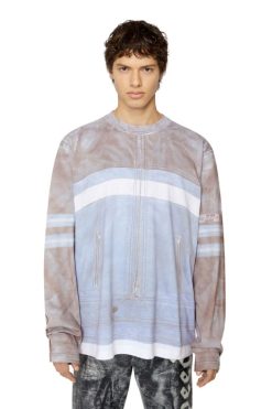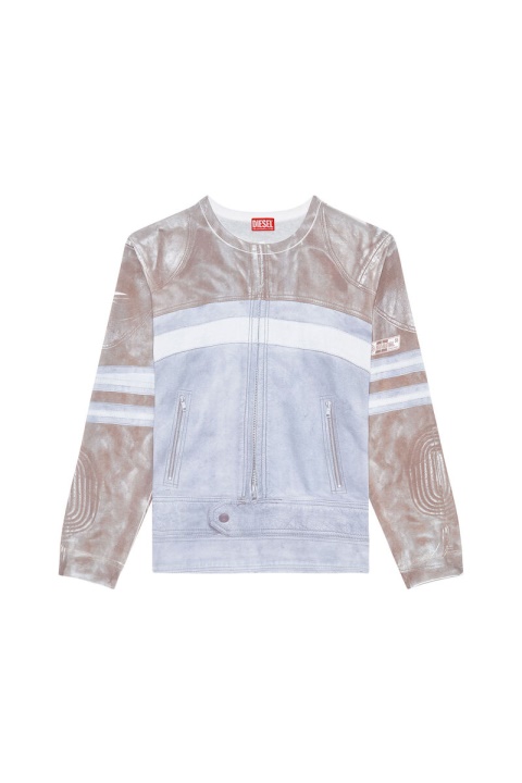 חלק מקולקציית סתיו 22 Runway Show, חולצת טריקו לגברים זו עם שרוולים ארוכים חתוכה להתאמה נינוחה מג’רזי כותנה באפקט וינטג’. הדפס ה-Trompe L’oeil שלו מחייה מעיל אופנוענים קלאסי עם רוכסנים, חיפויים ופרטי לוגו.