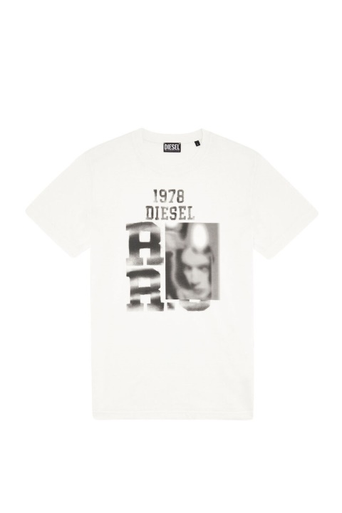 חולצה לגברים זו מעוטרת בהדפסה בגווני אפור עם פנים מטושטשות ומיתוג ‘דיזל 1978’ דהוי. הוא עשוי להיות מג’רסי כותנה קומפקטית ויש לו גזרה דקיקה.