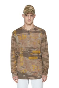 חולצת טי לגברים עם שרוולים ארוכים עם צווארון הנלי, חתוכה להתאמה רגילה מג’רסי כותנה מצולעים. לחלק העליון הזה יש שילוב של דפוסי הסוואה, מראה וינטג’ בלוי, הניכר בהדפסים הצהובים המכובסים הפזורים בכל רחבי הארץ.