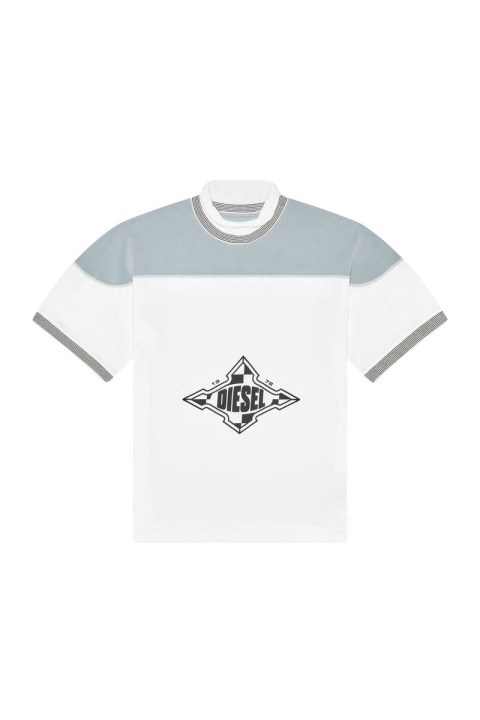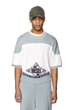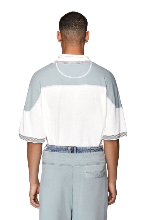 חולצת טריקו מכותנה עם עול קולור בלוק וחפתים סרוגים עם פסים. מעוצב עם צווארון סריג מגולגל, הוא כולל תפרים עליונים ניגודיים והדפס דיזל סדוק על החזה.