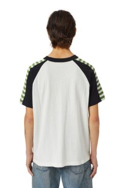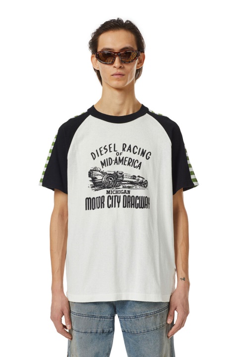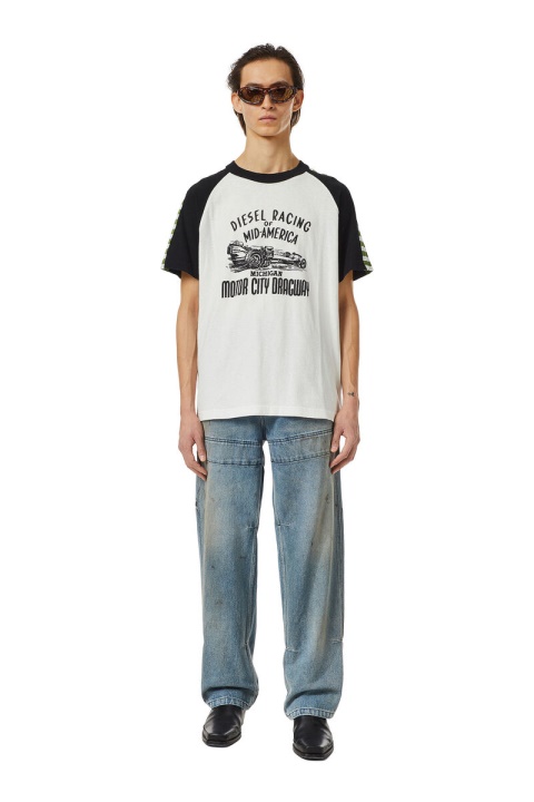 חולצת טי ג’רסי מכותנה מהותית עם שרוולים קצרים של ראגלן, מעודכנת עם תוספות פסים ניגודיות. שטיפת אבן והלבנת שמש לאפקט שחוקה, סגנון סגנון רגיל זה מעוטר בהדפסה מירוצים של דיזל על החזה.