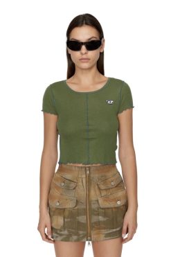 חולצת טריקו קצוצה לנשים, חתוכה להתאמה דקה ונוזלת מתערובת ויסקוזה-קשמיר מצולעת. עם קצה עם תפירת אוברלוק, הוא כולל טלאי ד רקום בחזה השמאלי.