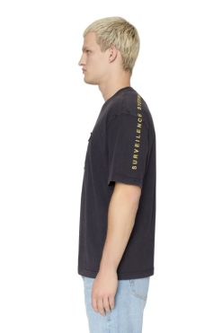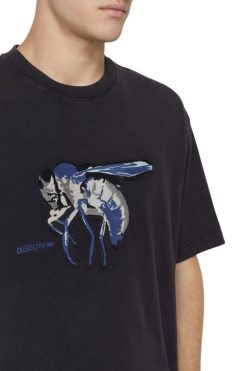 סגנון אוברסייז, חולצת טריקו לגברים זו מכותנה שטופה קלות בחומצה כדי ליצור מראה וינטג’ עם דהייה לאורך התפרים. יש לו טלאי טונאלי מודגש רקום עם מוטיב זבוב ואותיות רקומות על הכתף השמאלית.