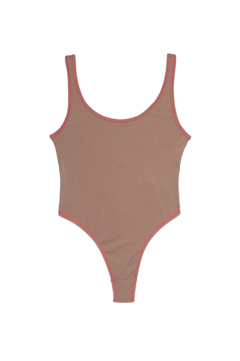 מוצג במגוון של גווני עור, גוף מיקרוסיבי מצולע זה עשוי באמצעות סיבי ניילון ממוחזרים. הצללית כוללת רמה גבוהה במיוחד, גב סקופ ובסיס חוטיני. סיום עם תפרים אדומים ניגודיים ותיקון לוגו אקארד.