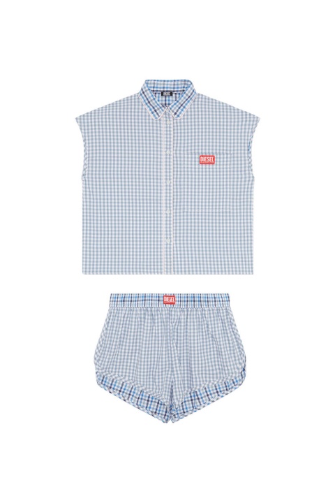 סט פיג’מות ג’קארד שני חלקים לנשים, מתהדר בחזית ג’ינג’ם ומשובץ מאחור. גזרה מכותנה פופלין, הן החולצה והן המכנסיים הקצרים מודגשים עם צנרת ניגודיות. מפורט עם כיס חזה ותג לוגו אקארד על חגורת המותן.