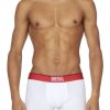 שלוש חבילות של תחתוני בוקסר לגברים בשלושה צבעים שונים, מרכיבים מכותנה מתיחה. כל זוג מכוסה בחגורת לוגו מנוגדת, כאשר המיתוג נראה רק חלקית.