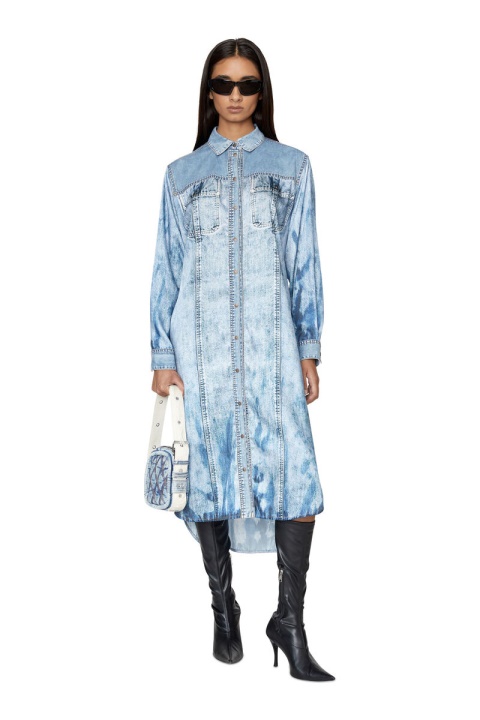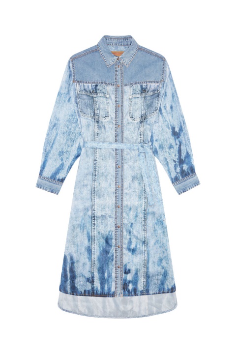 שמלת חולצה עשויה מסאטן טכנולוגי. החלק הנוזלי מציג הזה הדפס ג’ינס Trompe L’oeil, מצופה בדנים דיזל אותנטי ויש לו צללית חגורה עם מכפלת אחורית ארוכה יותר.