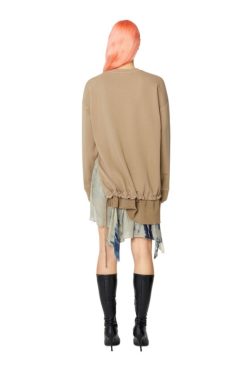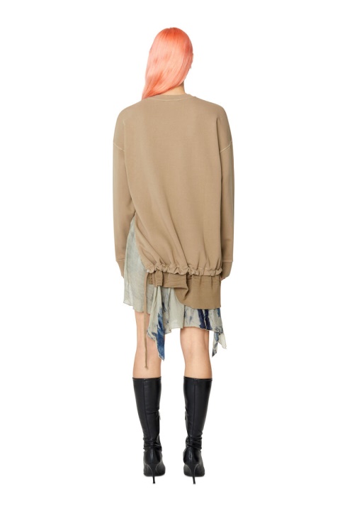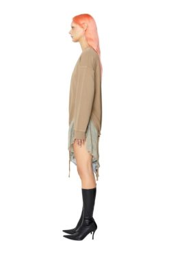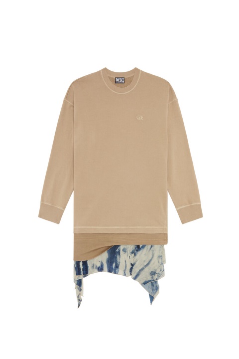 בצללית סווטשירט רפויה, לשמלת הכותנה הזו יש עיטור שיפון המציג הדפסה טרמפ ל’איל של ג’ינס משויש. הגזרה משתרעת ממכפלת שכבתית המפוצלת בצד אחד ומשתלבת עם שרוך. לוגו ‘סגלגל D’ רקום מעט את החזה.