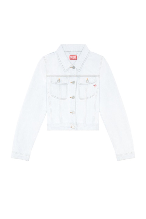 מעיל משאית. לסגנון דק זה יש מכפלת קצוצה מעט ולוגו D אדום רקום על כיס החזה. כביסה זו מעוצבת מג’ינס קבועה ובהתאמת גוון כחול בהיר במראה מולבן.