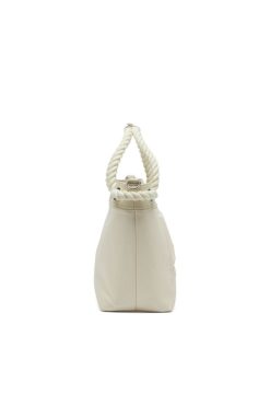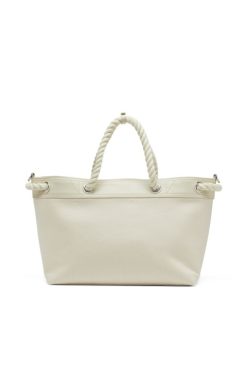תיק לנשים עם ידיות חבל עבות. חתוך מג’ינס לבן עשוי כותנה אורגנית, יש לו עיטורי עור גווניים ורצועת עור אופציונלית. לוגו מובלט מודגש מעט את החלק הקדמי.