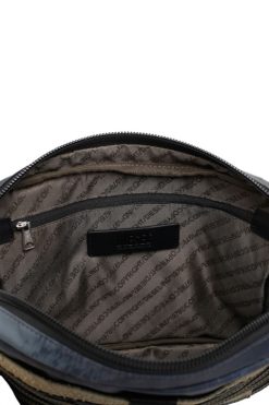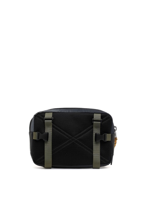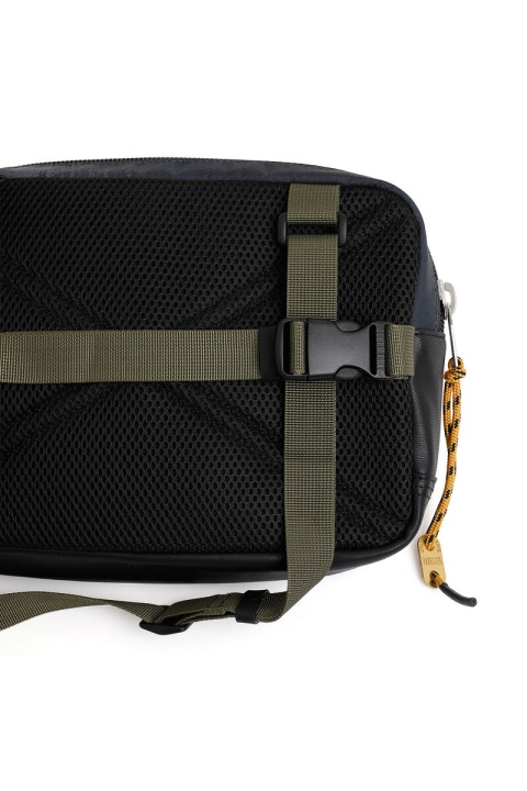 תיק רתמה מבד הסוואה משיכות מכחול, בסיס מחוזק וגב רשת מרופד. החוט האלסטי, סרטי הרשת וטלאי הסקוטש עומדים בבסיס המראה בהשראה צבאית. ניתן לענוד על גוף או כתיק חגורה.