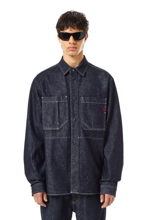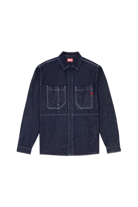 חולצה בסגנון בגדי עבודה עם גזרה קופסת ושסעים בצדדים. שלם עם תפרים ניגודיים ולוגו D רקום אדום.