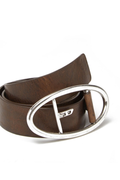 חגורת עור גמישה לנשים עם קצה מרובע. אבזם המתכת המקסי סגלגל מפורט עם לוגו ‘D’ קטן.