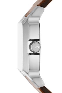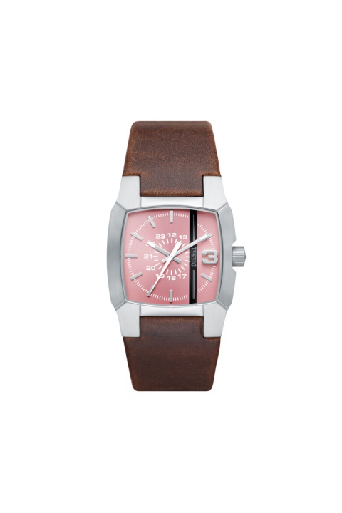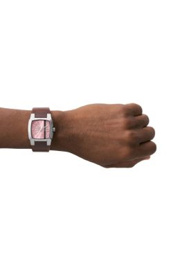 אחריות שעון Cliffhanger בגודל 36 מ”מ של דיזל כולל חוגה ורודה של קרני שמש, תזוזת שלוש ידיים ורצועת עור חומה עם עור שמקורו בבורסקאות מוסמכת LWG.