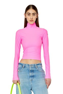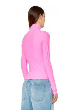 חולצת פלורסנט לנשים בג’רזי מתיחה קל משקל. מסומן עם שלט מתכת ‘סגלגל D’, סגנון מחבק גוף זה בעל צווארון גולף ושרוולים ארוכים.