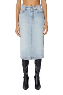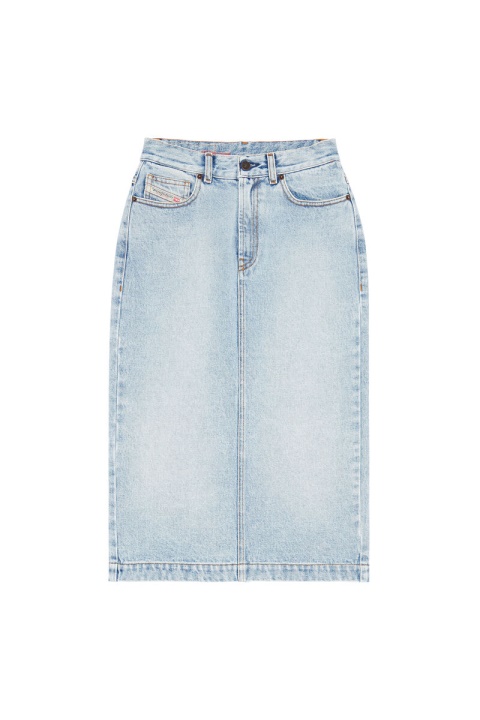 חצאית חמישה כיסים עם צללית עיפרון. ה-fix Denim מציג גוון תכלת במראה משומש אותנטי, המתקבל באמצעות תוף שוחקים מיוחד. הכביסה מיוצרת באיטליה.