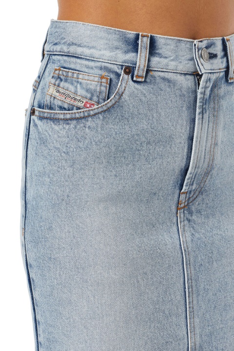 חצאית חמישה כיסים עם צללית עיפרון. ה-fix Denim מציג גוון תכלת במראה משומש אותנטי, המתקבל באמצעות תוף שוחקים מיוחד. הכביסה מיוצרת באיטליה.