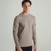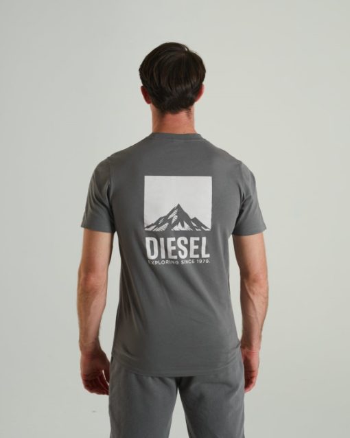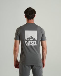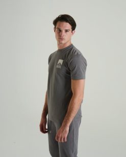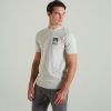 טי כותנה לגברים עם מיתוג בחזה הקדמי בעיצוב מרקם והדפס מרקם אחורי ממותג. הדוגמנית לובשת מ. מומלץ להקפיד על מידה רגילה. 100% כותנה