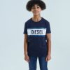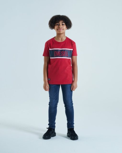 לוח חזה עם הדפס לוגו לבנים TeeModel הוא בן 11 ולובש מידה 11 עד 12