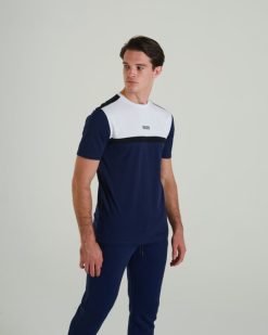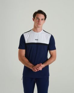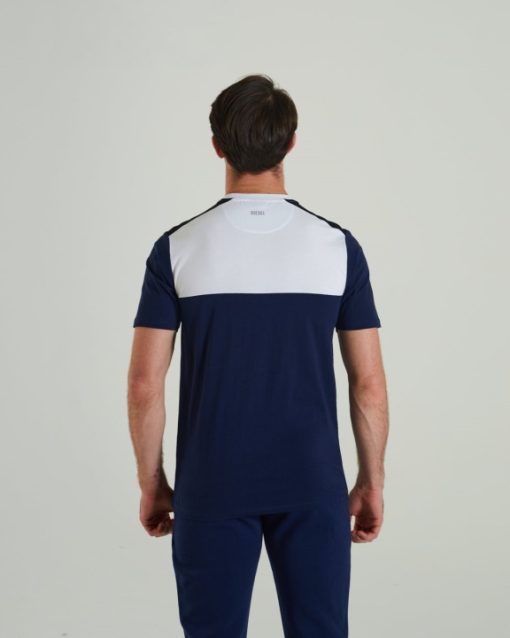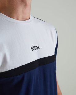 טי כותנה רכה לגברים בעיצוב קולור בלוק, הדפסה ג’ל בחזה ולוגו DIESEL רפלקטיבי בצוואר האחורי. הדוגמנית לובשת מ.