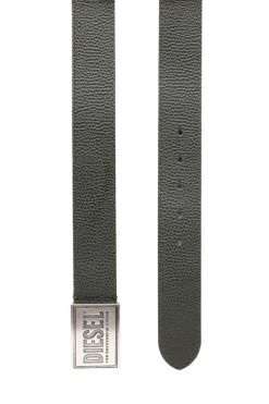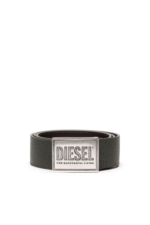 חגורה לגברים עשויה מעור גרגירים. אבזם הצלחת מובלט בלוגו Diesel For Successful Living ובעל גימור כסף מיושן מעט.