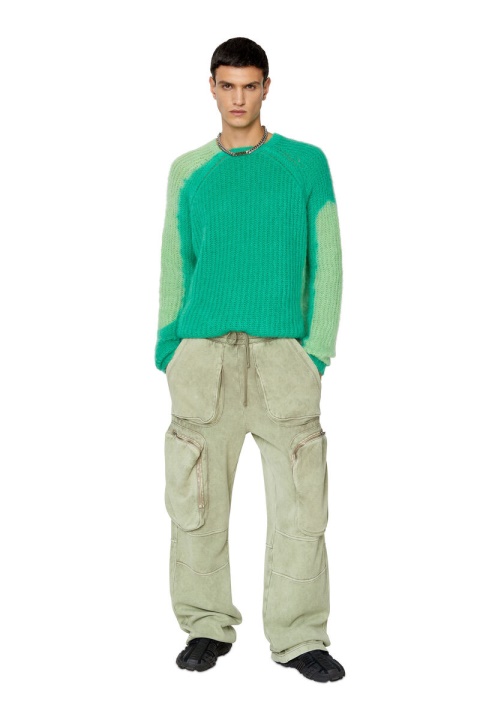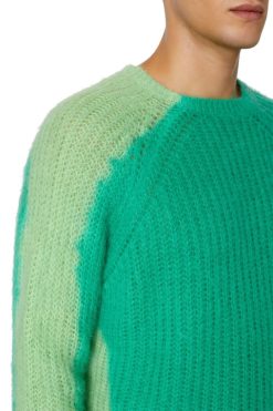 מגשר לגברים משוחרר בצללית, עם פסים של צבע בהיר יותר בשרוולים ובצדדים כמו מתהליך הצביעה הכפולה. הוא סרוג בצלעות מתערובת אנגורה ומוברש כדי לשפר את התחושה הרכה והמטושטשת.