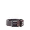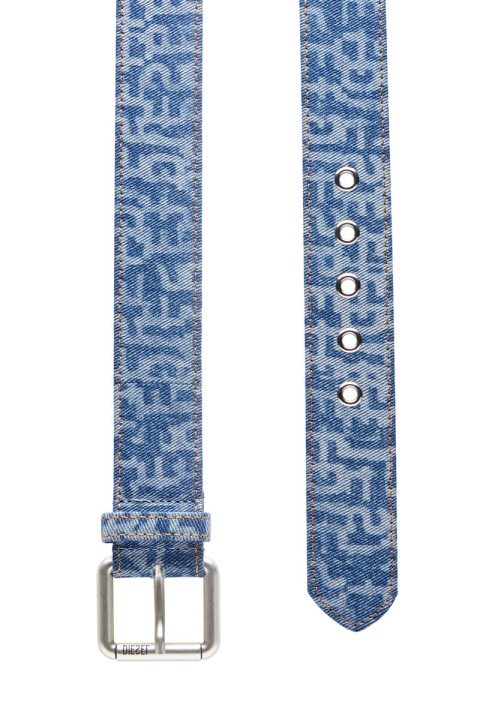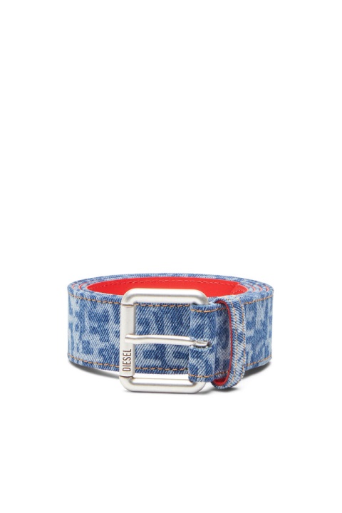 חגורת כחולה גברים עשויה מג’ינס איטלקית ועור אדום, מהודקת באבזם רולר מתכתי. צד הג’ינס מציג דוגמת מונוגרמה בלייזר ותפירת טבק קלאסית.