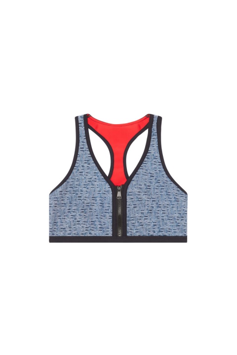 לחולצת השחייה הזו יש צללית ספורטיבית עם רוכסן קדמי וסגירת אבזם. הוא נחתך מבד נמתח מלוכד שמודפס כדי להידמות לג’ינס מונוגרמה כחולה.