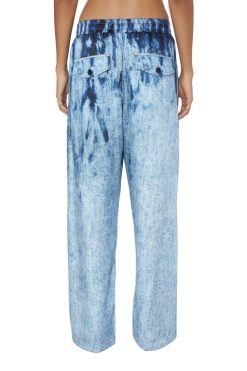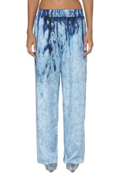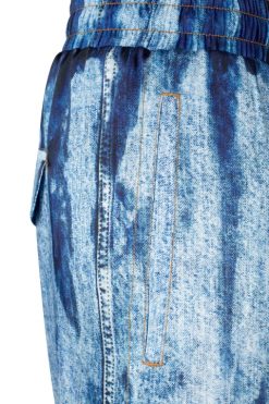 מכנסיים לשני המינים האלה נחתכים מבד סאטן בהיר, ומציגים הדפסה ג’ינס Trompe L’oeil.