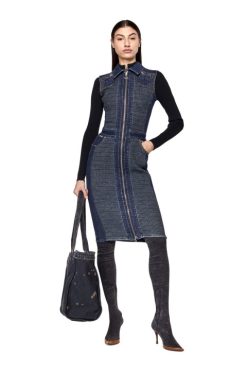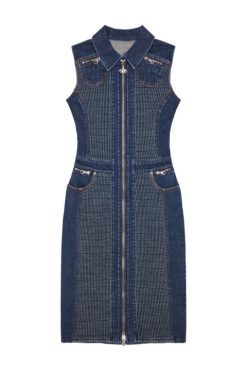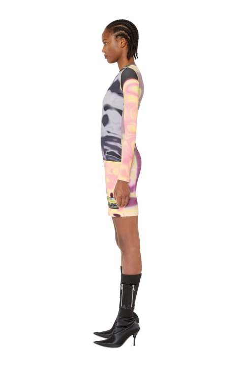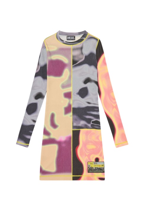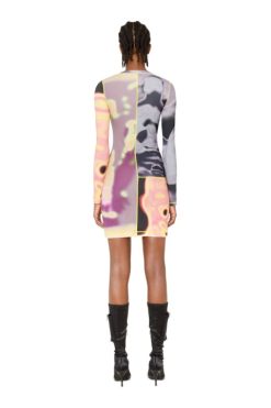 שמלת מיני זו עשויה מפאנלים של ג’רסי כותנה מתיחה מצולעים התאמה במחבקת גוף. מפורט עם תיקון לוגו ותפירת כריכה צהובה, הוא מודפס עם שלוש תמונות תרמו שונות, יוצר טלאים ססגוני טריפי.