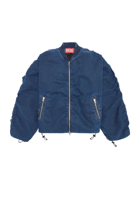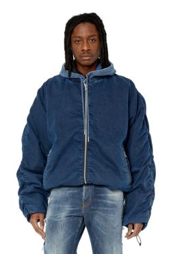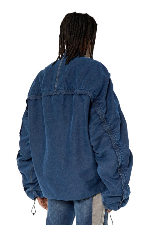 ז’קט גברים מרופד זה חתוך מג’ינס בצללית נינוחה ומפציץ. השרוולים והגב משורטטים עם קצוות גולמיים לאורך התפרים, בעוד שהחפתים והשולי נצמדים פנימה עם שרוכים. חלק מקולקציית Diesel Rehab Denim. הכביסה בכחול כהה כוללת אפקטים של צללים לגימור משפיע.
