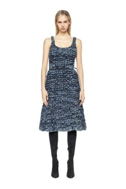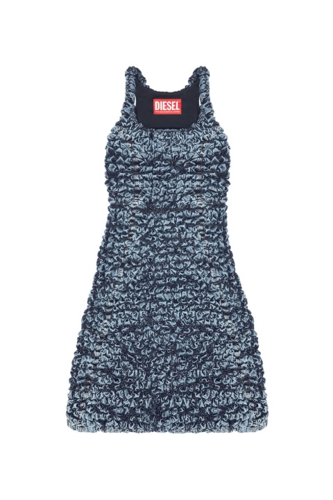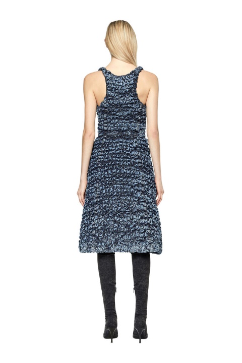 חלק מקולקציית תצוגות האופנה של אביב-קיץ 22′, שמלת מידי זו עשויה מג’ינס קבוע לאחר מניפולציה מופתית לכדי מלאות ומרקם באמצעות תפירת חלוק ענק. הוא כולל מחוך טנק מצויד וחצאית בקו א.
