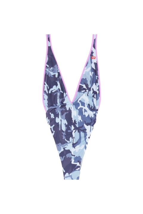 תחפושת שחייה לנשים משולבת צווארון V עמוק וגב סקופ נמוך. הדפס הקאמו כולל גוונים מנוגדים בעדינות בכל צד לאפקט טלאים, עם שוליים בכריכה ניגודית.