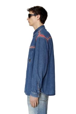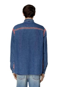 חולצה זו בהשראת עיצובים ארכיונים. כולל תוספת לוגו וינטג’ וצמדני מתכת, הוא עשוי מלוחות של ג’ינס בצבע כחול בינוני, מקושרים יחד עם בד אדום מנוגד. הכביסה הסופית מעניקה מראה טבעי לחיות.