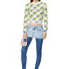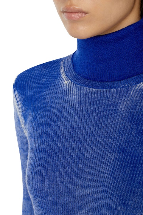 צווארון גולף מצולע לנשים סרוג מצמר גולמי, מאופיין בטיפול מודפס פנימי להשפעה דהויה על התפרים. עם פסים בשוליים ובחפתים, מגשר דק זה ממותג עם לוח D מתכתי.