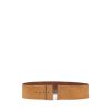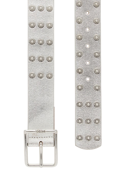 חגורה לגברים זו עשויה כסוף עם מסמרות ג’ינס ממותגות ואבזם סיכת מתכת.