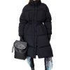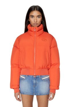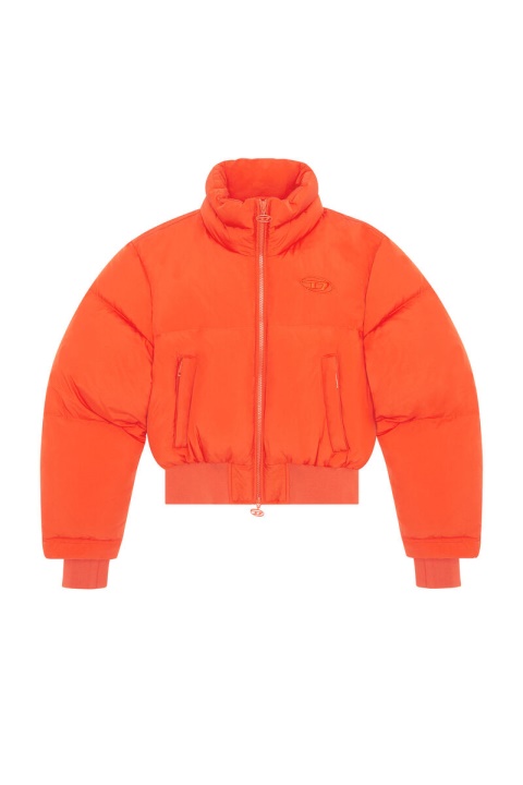 לז’קט חורף לנשים זה יש צללית נפוחה עם צוואר משפך וגזרות מצולעות. הוא חתוך מניילון מקומט דוחה מים מרופד ועמוס בפוך בידוד. לוגו רקום לא מודע לקשט את החזה.