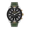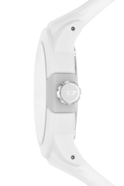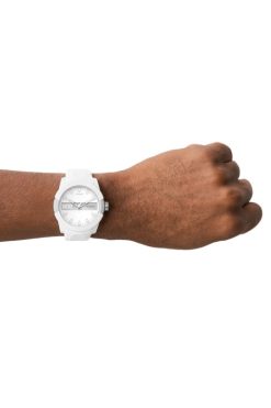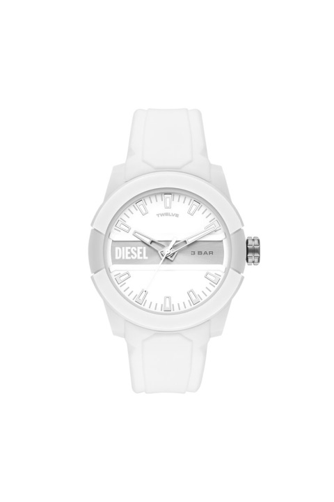 אחריות השעון Double Up בגודל 43 מ”מ של דיזל כולל חוגת קרני שמש לבנה, תנועה של שלוש ידיים ורצועת סיליקון לבנה.