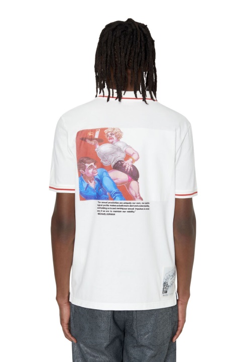 בשיתוף עם Tom Of Finland Foundation (ToFF), חולצת הפצה קצרה השרוולים הזו כוללים הדפסים גרפיים מקטלוג העבודות של קרן Tom Of Finland. הוא עשוי מכותנה פיקטית לבנה עם הגורם הדרוש, ומפורט עם פרט פס על הצווארון והחפתים. עם הציטוט של האסיים והטלאי הייחודי של הקפסולה בגב.