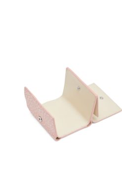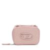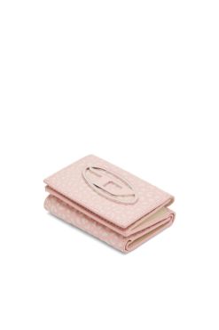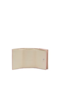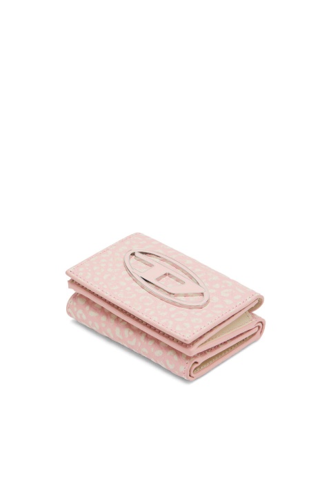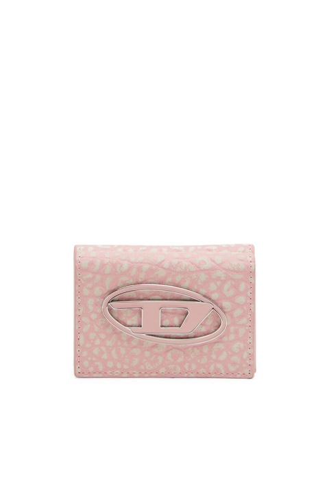 ארנק קומפקטי לנשים מעור מובלט עם גרגירי בועות. מעוצב עם מקטע משולש וכיס למטבעות, יש לו גוון ורוד סומק וציפוי עמיד בפני צעדות. חומרה ‘אובלי ד’ מצופה אמייל מייפה את החלק הקדמי.