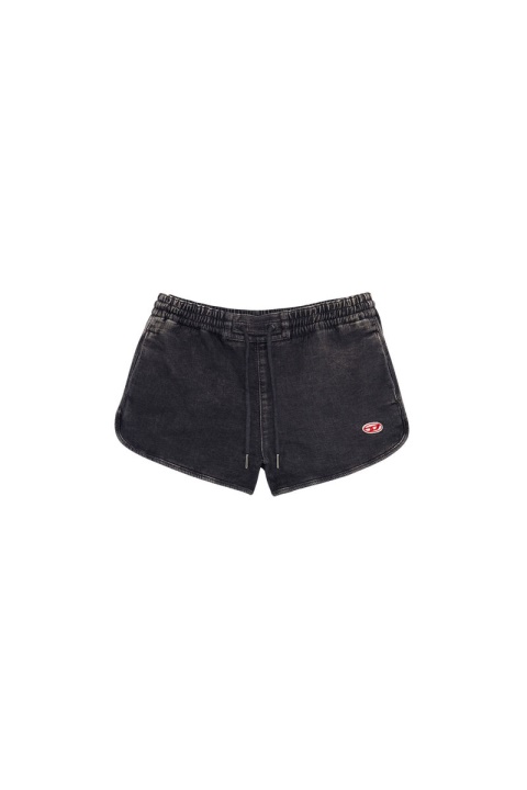 מכנסי ריצה קצרים עם מותניים נמוכים וחגורת שרוך אלסטית. הם עובדים מ-Track Denim לנוחות מירבית וממותגים עם תיקון D אובלי. לכביסה זו גוון אפור כהה אחיד, עם אפקטים משומשים מעט בתפרים.