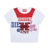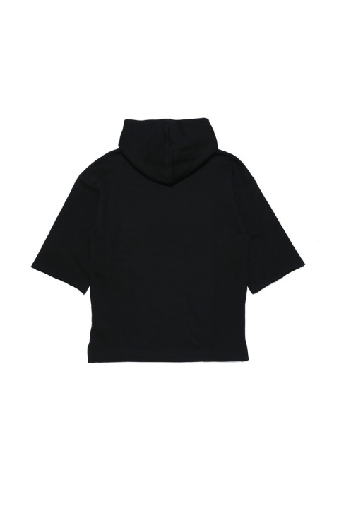 שמלת קפוצ’ון לילדות זו גזורה מג’רזי כותנה שחורה, מעוצבת עם שרוולים קצרים ושסעים בשוליים בצדדים. החזה כולל הדפסה לוגו ‘Disturb’ של דיזל מקושקש.