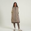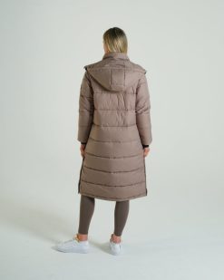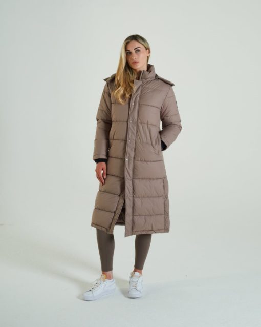 מעיל נפוח ארוך בעל קוים עם נצמדים לתפר הצד. תג גומי על זרועו השמאלית של הלובש. הדוגמנית לובשת מידה XS. מילוי 100% פוליאסטר ממוחזר.