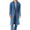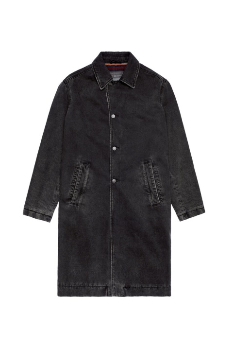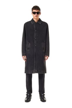 מעיל מכוניות ג’ינס עד הברך בהתאמה רגילה. זוג ג’ינס מתקן זה מציג שטיפה שחורה ונקייה.