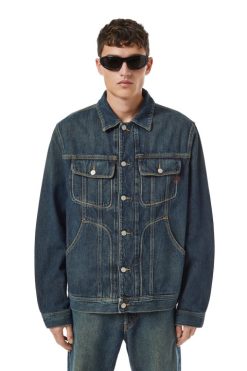 מעיל משאית. עיצוב יוניקס זה, חתוך להתאמה רגילה, כולל מבנה כיס מעוקל בהשראת ארכיון דיזל. סיים עם רקמת לוגו ד אדום. כביסה כחולה כהה זו עשויה מג’ינס קבועה משדרת מראה ועיצוב משומשים, מועשרת באפקטים של לכלוך צהוב מינרלי.