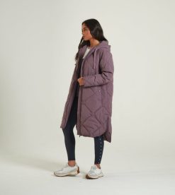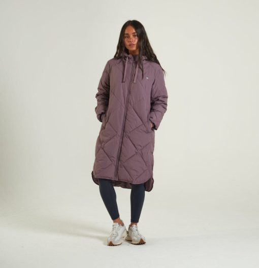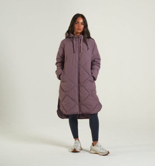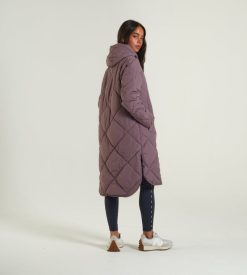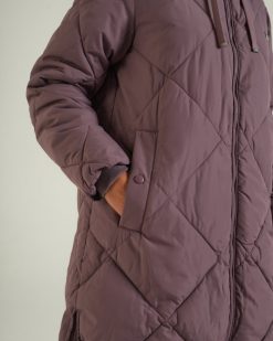 מעיל מרופד יהלום בעל קו ארוך בגזרה רגועה. תג מתכת קטן על החזה השמאלי של הלובש