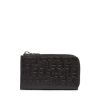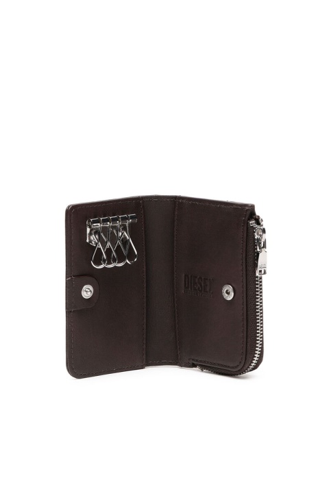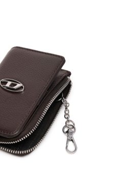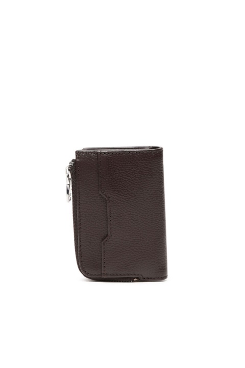 נרתיק גברים רב-תכליתי זה עשוי מעור גרגירים ומפתח וחלק כרטיס הנצמד בנקישה וכיס מטבעות מהודק ברוכסן בצורת L. לוח D כסוף מרוכז בקפידה בחזית.