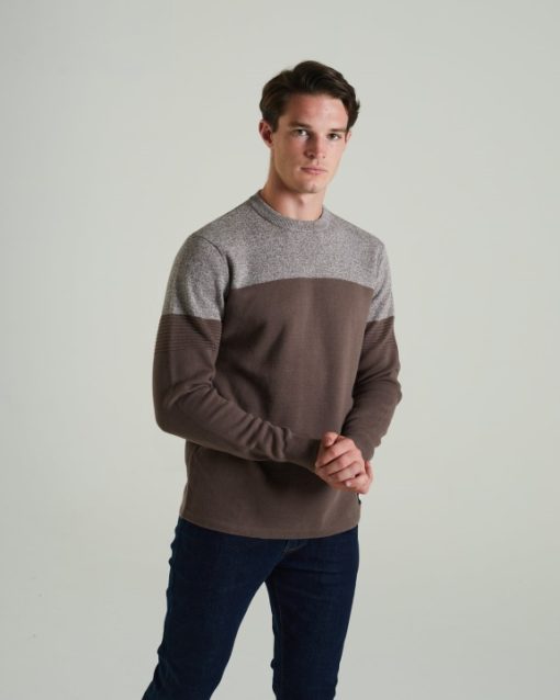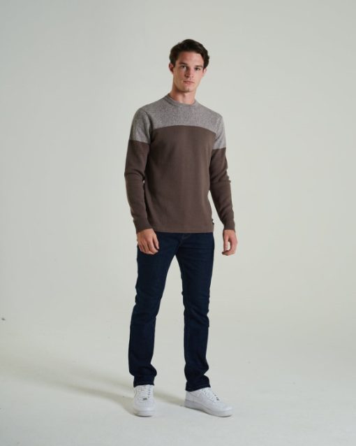 סוודר כותנה רך במיוחד עם צווארון עגול עם ציפוי ניגודיות, חפתים מצולעים ושולי, תג ממותג דיזל. הדוגמנית לובשת מ. מומלץ להקפיד על מידה רגילה. 100% כותנה