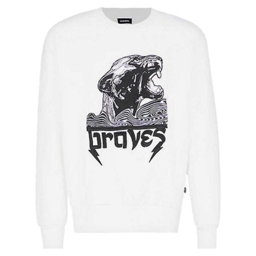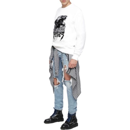 בעונה זו דיזל משחרר את העיצובים הרועשים שלו. צלליות נקיות למראה איקוני במתח גבוה. סווטשירט כותנה עם צווארון עגול זה מיושם עם תיקון מקסי בעל קצוות גולמיים בחזית, מעניק גרפיקת “פנתר אמיצים” מנוגדת באסתטיקת הסלע החותמת של המותג. הגזרות עם הצלעות הנמתחות נצמדות לפרופיל הספורט המנוסה.